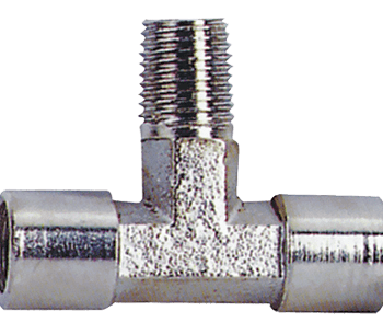 T-образный переходник (тройник) позволяет подсоединить к пневмомагистрали дополнительный участок. Крепление — резьба 3/8″…